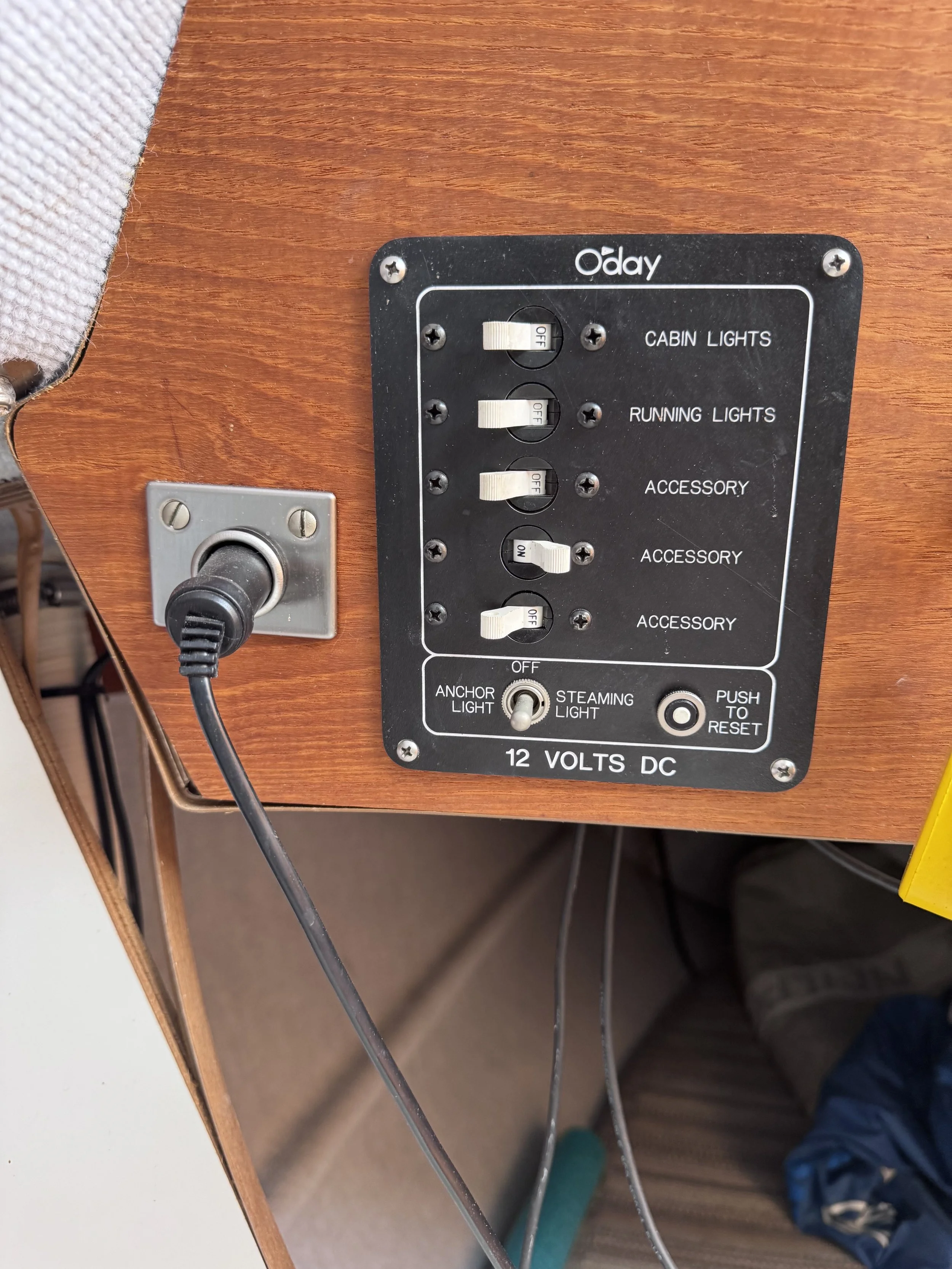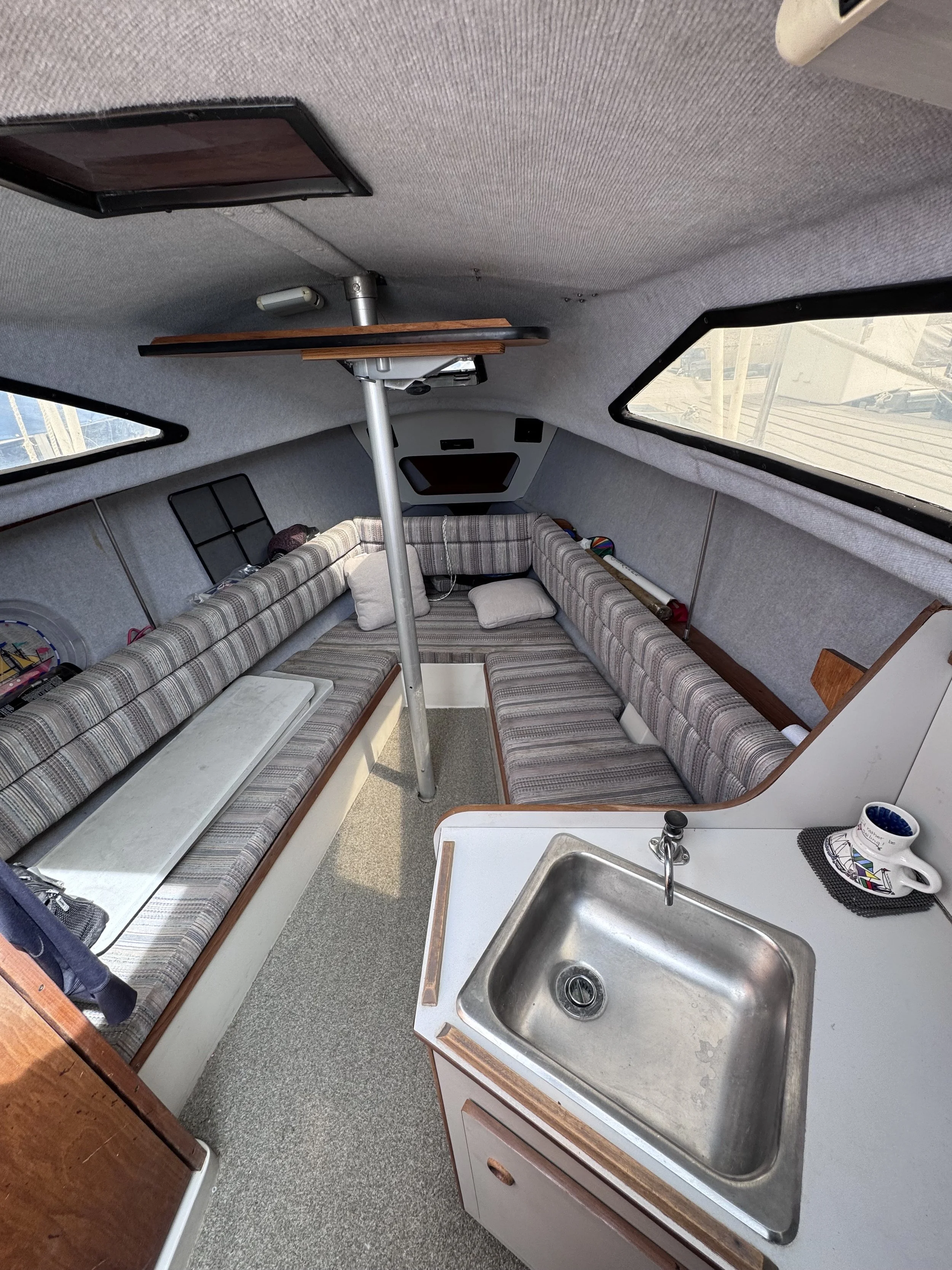 This 1991 O’Day 240 Sailboat is powered by an outboard Yamaha 8HP engine with electric start. Compact yet capable, it’s well-suited for day sailing or weekend trips on the lake.